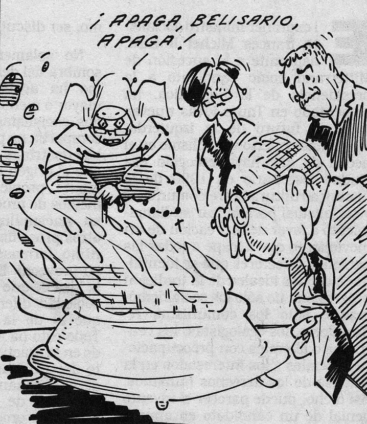 Caricatura de Osuna en El Espectador, domingo 21 de febrero de 1993, titulada Conflagración, alusiva a la celebración de los 70 años de Belisario Betancur en Casa de Poesía Silva con la participación de María Mercedes Carranza, Gabriel García Márquez y la Monja de Palacio de Botero, testigo del Holocausto del Palacio de Justicia.