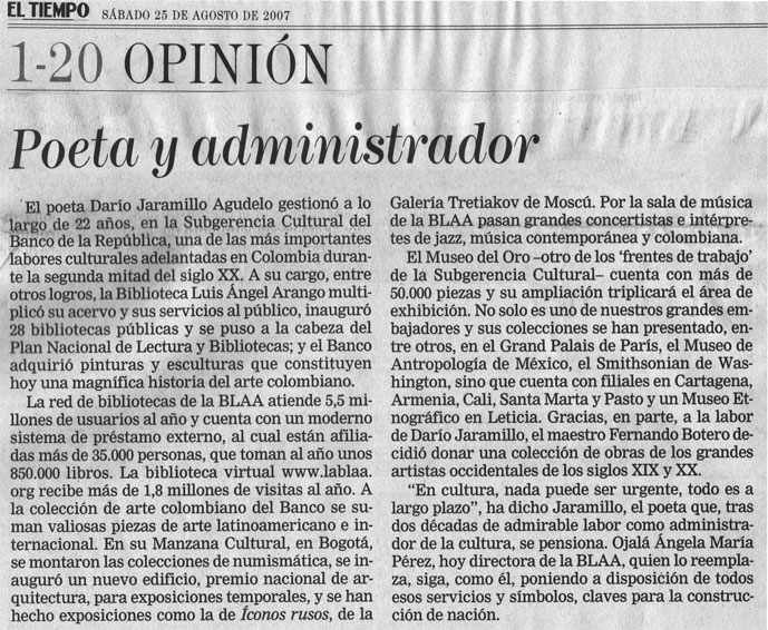 Sólo prebendas, favoritismos, exclusiones, persecuciones, ninguneo y perversidad es lo que produce esa Gerencia Cultural, que levantó en el centro de Bogotá una laberíntica pirámide de Babilonia cuyo único propósito fue, en últimas, la instalación, en los sótanos, de una librería ambulante para ofrecer los cientos de existencias de libros del llamado Fondo de Cultura Económica de México y los inaccesibles, por su precio, volúmenes de la editorial Pre-textos, donde terminara, por cierto, de ser divulgada la magna obra del sub-gerente de marras. Y un restaurantico, con precios de clase media y sabores de clase media y horarios de clase media, para una legión de muchachos bien parecidos y vestidos a crédito que sueñan con los libros, los cuadros, las músicas de alas y las vasijas de oro que nunca tendrán, a no ser que el todopoderoso los lleve a su inmensa oficina de enfrente, donde como Nabucodonosor reinara por un cuarto de siglo.