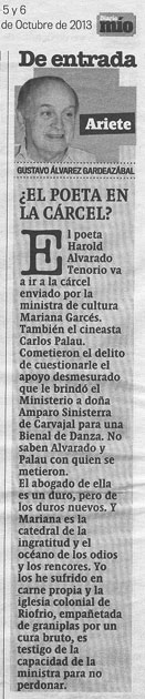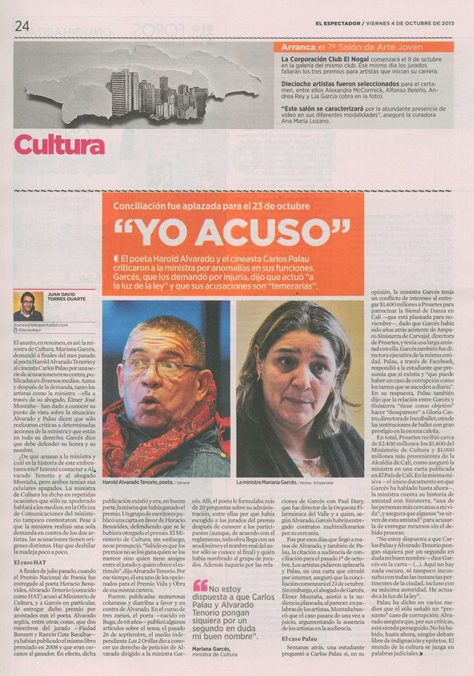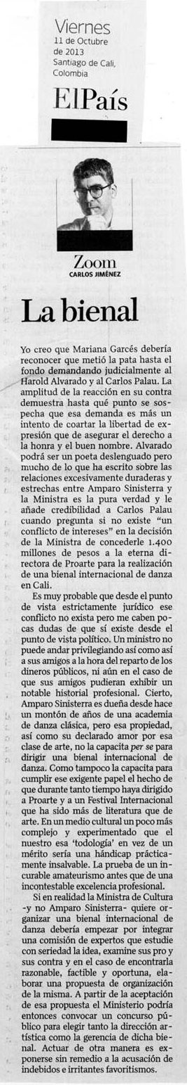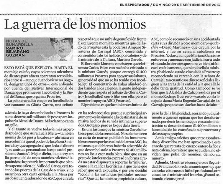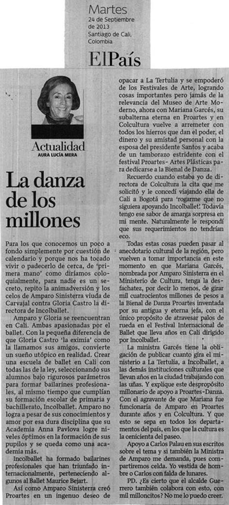 A mediados de la segunda semana de septiembre el cineasta Carlos Palau preguntaba, en una red social, si concurría un conflicto de intereses [situación en las que el juicio o la acción de un individuo tiende a estar indebidamente influenciado por un interés secundario, de tipo generalmente económico o personal] cuando Mariana Garcés Córdoba, Ministra de Cultura del gobierno Santos, asignaba a Doña Amparo Sinisterra Barberena viuda de Carvajal Quelquejeu: ex directora de Colcultura del gobierno Betancur, ex embajadora consorte en Francia, madre del actual embajador en Francia, suegra de Luís Carlos Sarmiento Angulo, directora de Proartes, Academia de Danza Pavlova, Emisora Carvajal, Fundación Carolina del Grupo Prisa, ex de TV Pacifico, Festival de Arte, etc., lugares casi todos donde ha estado también la ministra del despacho, la miserable suma de Dos Mil Millones de Pesos, más el 50% de la estampilla Pro desarrollo del Valle del Cauca, para financiar el nuevo juguete de la poderosa viuda que ha decidido no lidiar más con intelectuales y poetastros, a quienes ha sometido por más de medio siglo, y va a dedicarse a un Festival Mundial de Danza para finiquitar la vieja disputa que mantiene con Gloria Castro, de Incolballet, desde el día que Giovanni Brinatti, un danzarín de la Opera de Roma y Scala de Milano eligió a Castro para enviarla a Checoslovaquia e Italia, desde donde regresaría para levantar de las cenizas, la vieja escuela de ballet de Cali, donde la ya envidiosa candidata a Carvajal pretendía contratar a Alexander Borisovich Godunov, de quien se había prendado.