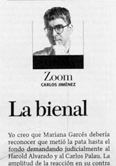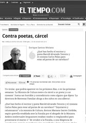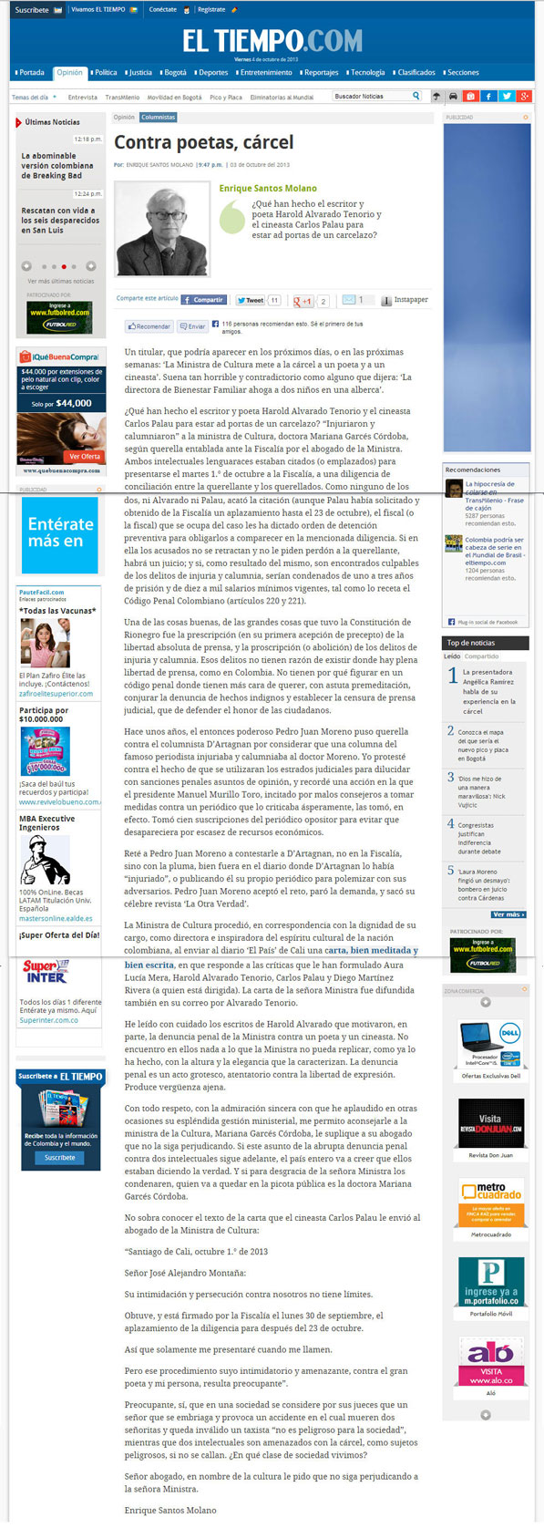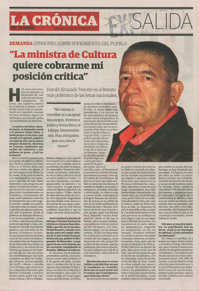 La Ministra ha sido además inculpada, por el director tulueño, de colocar en una importante dependencia a un tal Oswaldo Osorio, “el comentarista de cine más odioso y resentido de este país”, mientras el prestigioso crítico de arte con residencia en Madrid, Carlos Jiménez Moreno, le atribuye querer acabar con el Salón Nacional de Artistas, al entregarlo en la edición de este año, a un grupo de espectaculeros venidos de otras tierras y naciones con TLC con Colombia. Tres semanas atrás, otro malqueriente le había sindicado de proporcionar un premio, de 20 mil dólares, a un miembro de un grupo racial súper minoritario, aduciendo que los quillacinga apenas representan el 0,54% de la población vallecaucana, mientras los mestizos y los blancos constituyen el 72,23% y las negritudes el 27, 21% del total. La ministra ha respondido que las adivinanzas también son poesía, según la señora Sinisterra Barberena viuda de Carvajal Quelquejeu y su asesor lírico, el hijo de Zuleta.