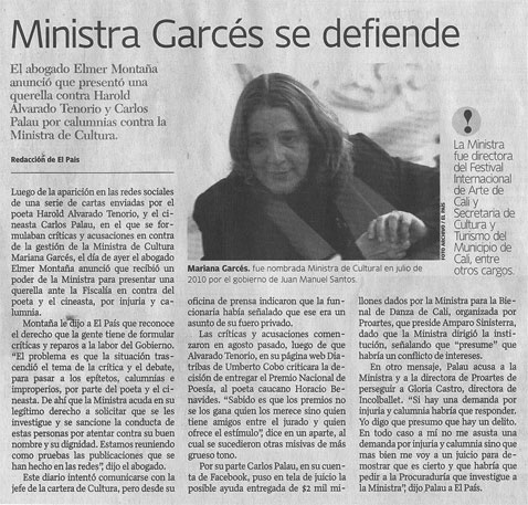 Otros archivos relacionados -- Carta de la Ministra Garcés sobre la polémica de la bienal de danza -- Gloria Castro, directora de Incolballet, responde con carta a la ministra de cultura -- Comentario de Darío Henao Restrepo, Decano de Humanidades, Univalle -- Derecho de petición a la Ministra Mariana Garcés Córdoba -- Segundo derecho de petición a la Ministra Mariana Garcés Córdoba -- Carta del Arquitecto Germán Tellez a HAT sobre el Ministerio de Cultura -- La ministra y el cine, según Juan Diego Caicedo de la Universidad Nacional